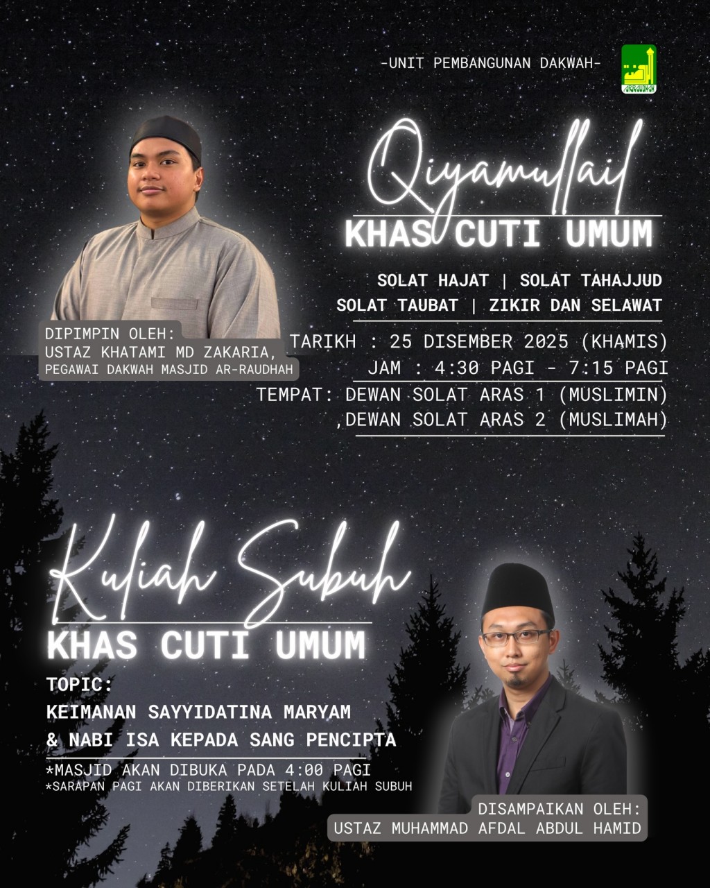Join us for Qiyamullail on Thursday, 25 December 2025, from 4:30 AM to 7:15 AM – featuring Solat Hajat, Tahajjud, Taubat, Zikir & Selawat, led by Ustaz Muhd Khatami.