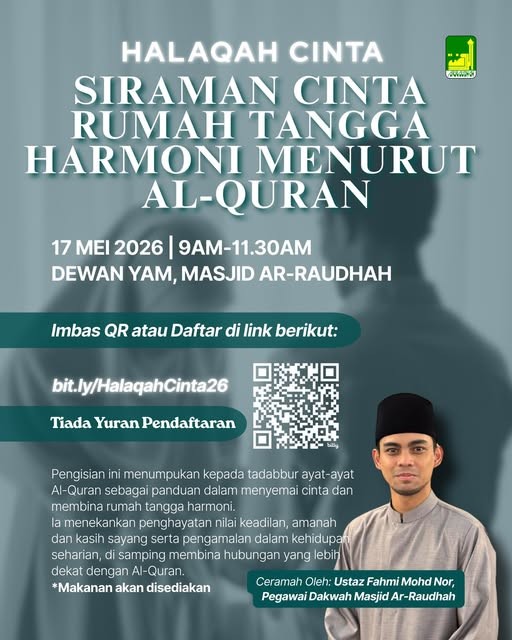 Ayuh sertai Halaqah Cinta: Siraman Cinta Rumah Tangga Harmoni Menurut Al-Quran — satu sesi tadabbur yang menyentuh hati dan membimbing kita menyemai kasih sayang, keadilan dan amanah dalam rumahtangga berteraskan Al-Quran.
